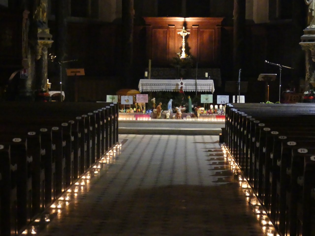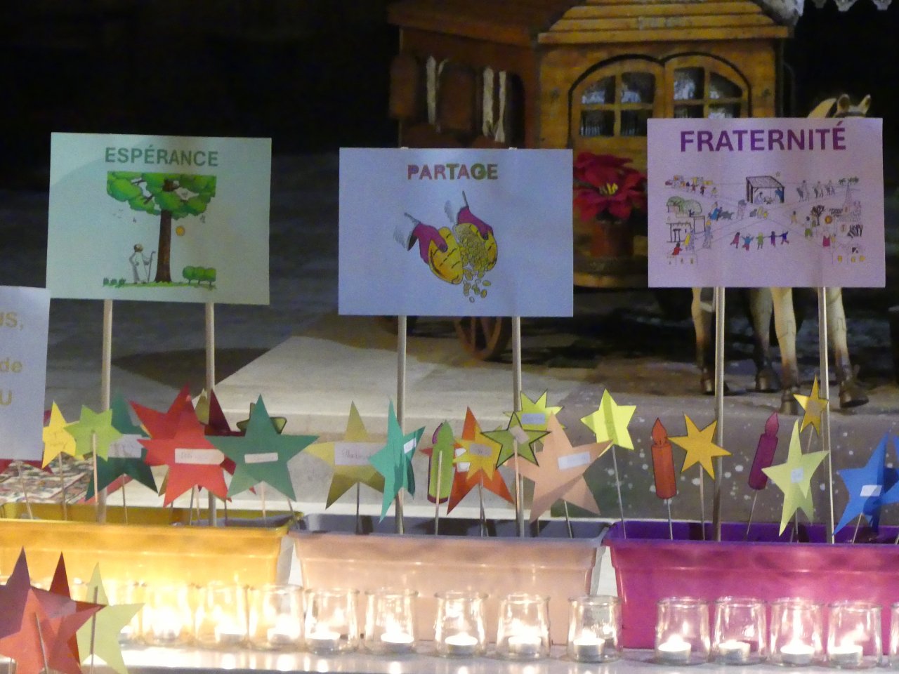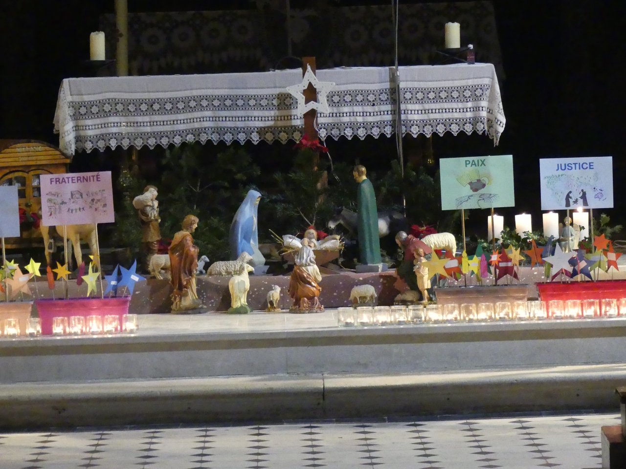 L'église était ouverte sur un chemin de lumières jusqu'à la crèche. Autour de braseros et de buches finlandaises, les enfants de l'école ont interprétés de bon coeur quelques airs accompagnés par Catherine à l'orgue de barbarie.